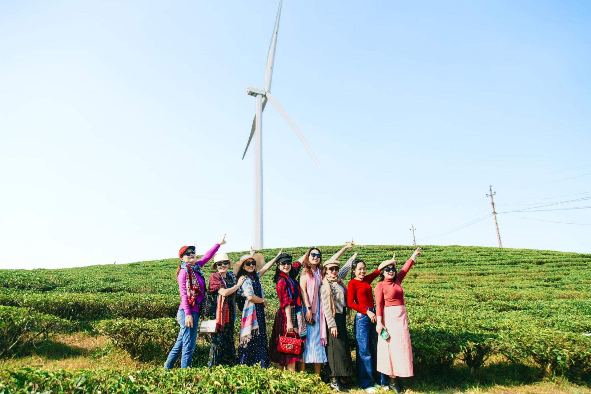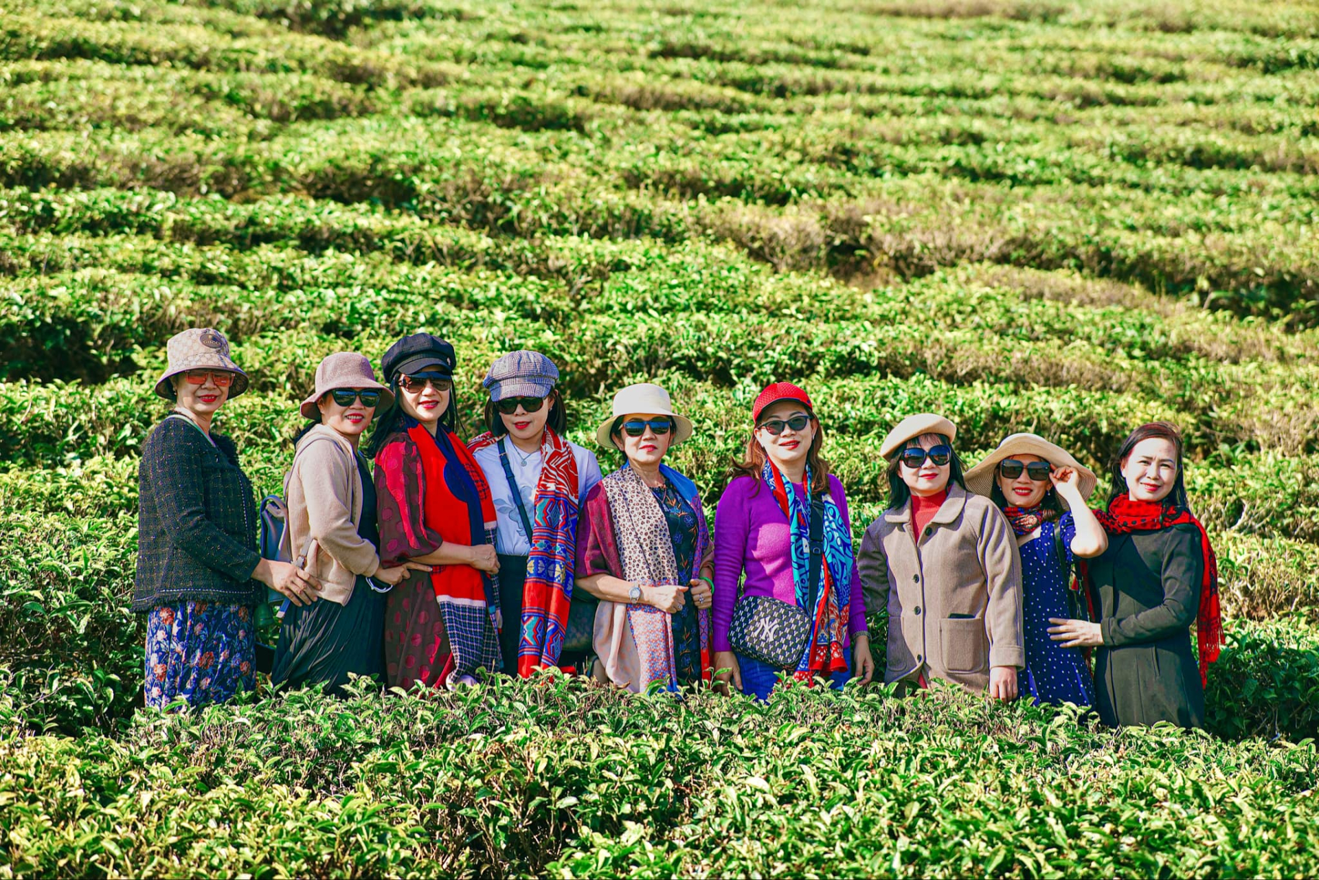 ( Khách đoàn Tân Triều Travel check-in trên cánh đồng chè xanh mướt )