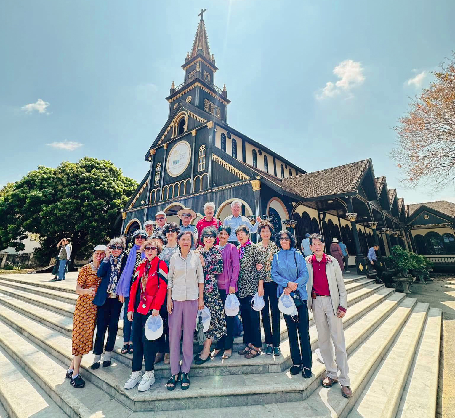 Đoàn tiếp tục ghé tham quan Nhà thờ gỗ Kon Tum (Nhà thờ chính tòa giáo phận Kontum). Nhà thờ được làm hoàn toàn bằng gỗ cà chít, theo phong cách Roman kết hợp với kiến trúc nhà sàn của người Ba Na được xây dựng 1913 kéo dài đến năm 1918 mới hoàn tất. là niềm tự hào của người dân thành phố Kon Tum và luôn có sức hút mãnh liệt cho những du khách đến với vùng cao nguyên bạt ngàn....